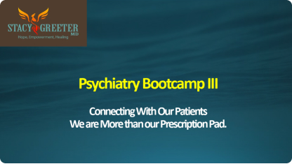 Dr. Greeter regularly gives virtual and in-person presentations from her Psychiatry Boot Camp Series. Mental health professionals and other clinicians can use these educational resources to learn some of the tools and techniques of psychiatry online.